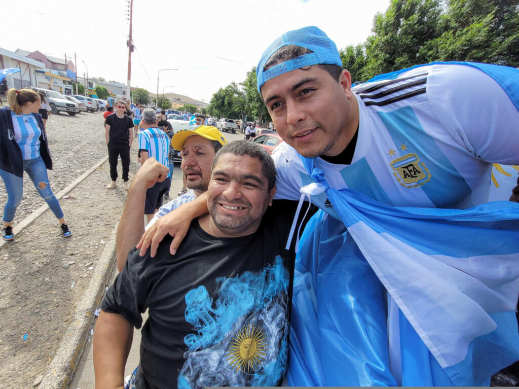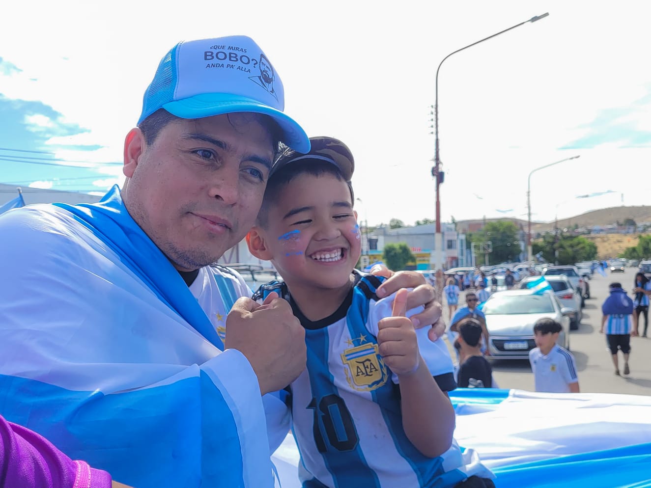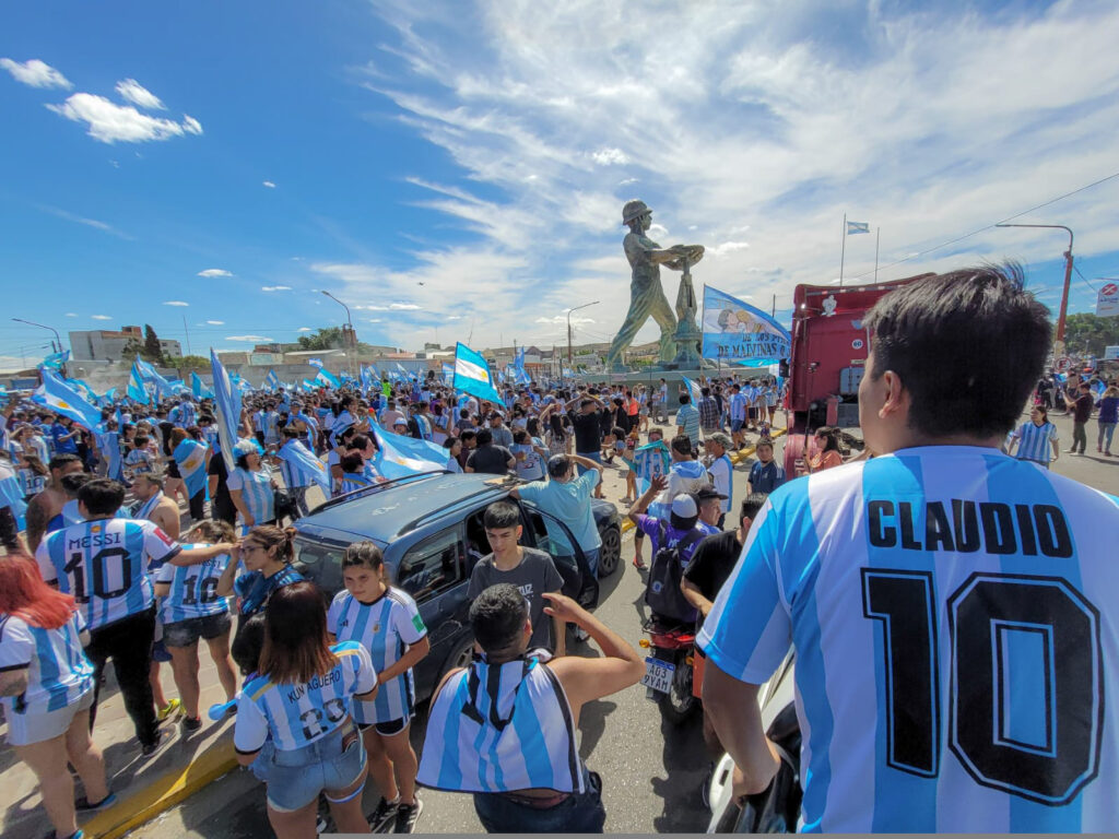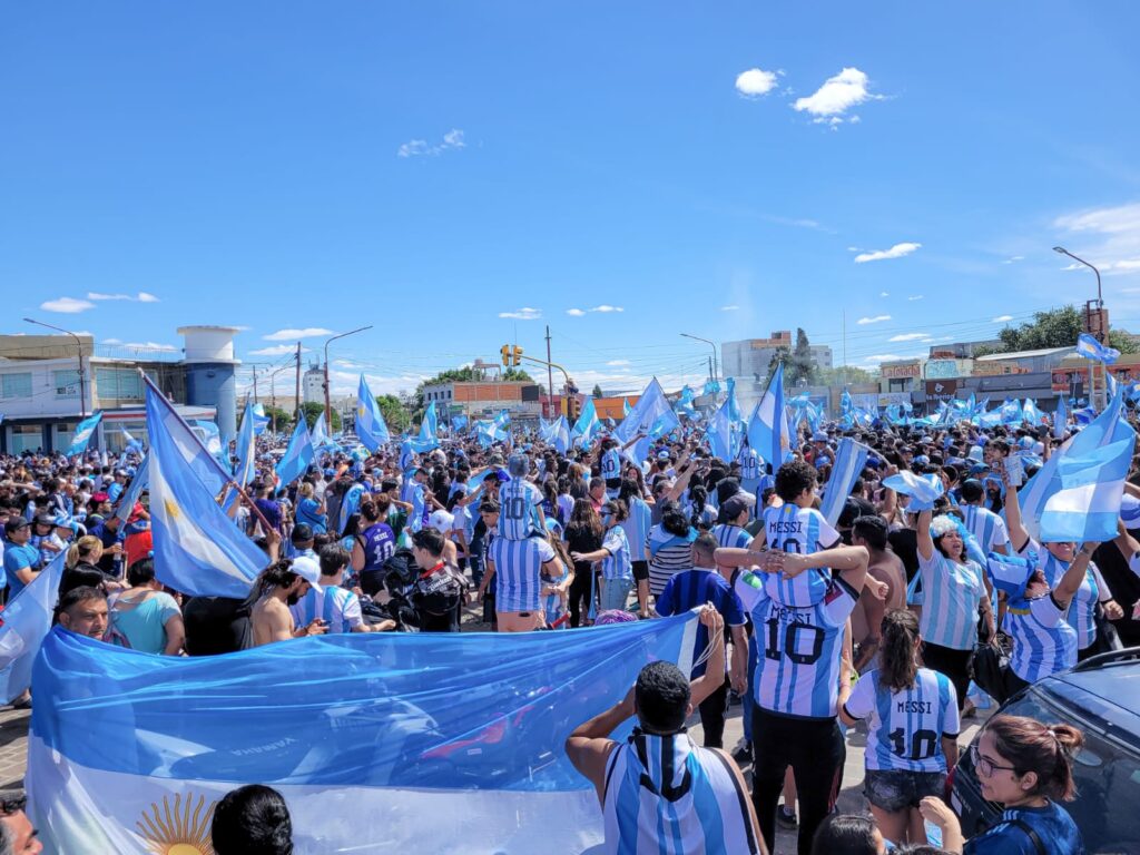Con banderas, camisetas y gorros albicelestes, en medio de cánticos que celebran la gesta de la “Scaloneta”, la gente tiñó de celeste y blanco cada rincón de Caleta Olivia y el resto de Santa Cruz. Familias enteras congregadas en las principales esquinas de los barrios y de cada localidad.