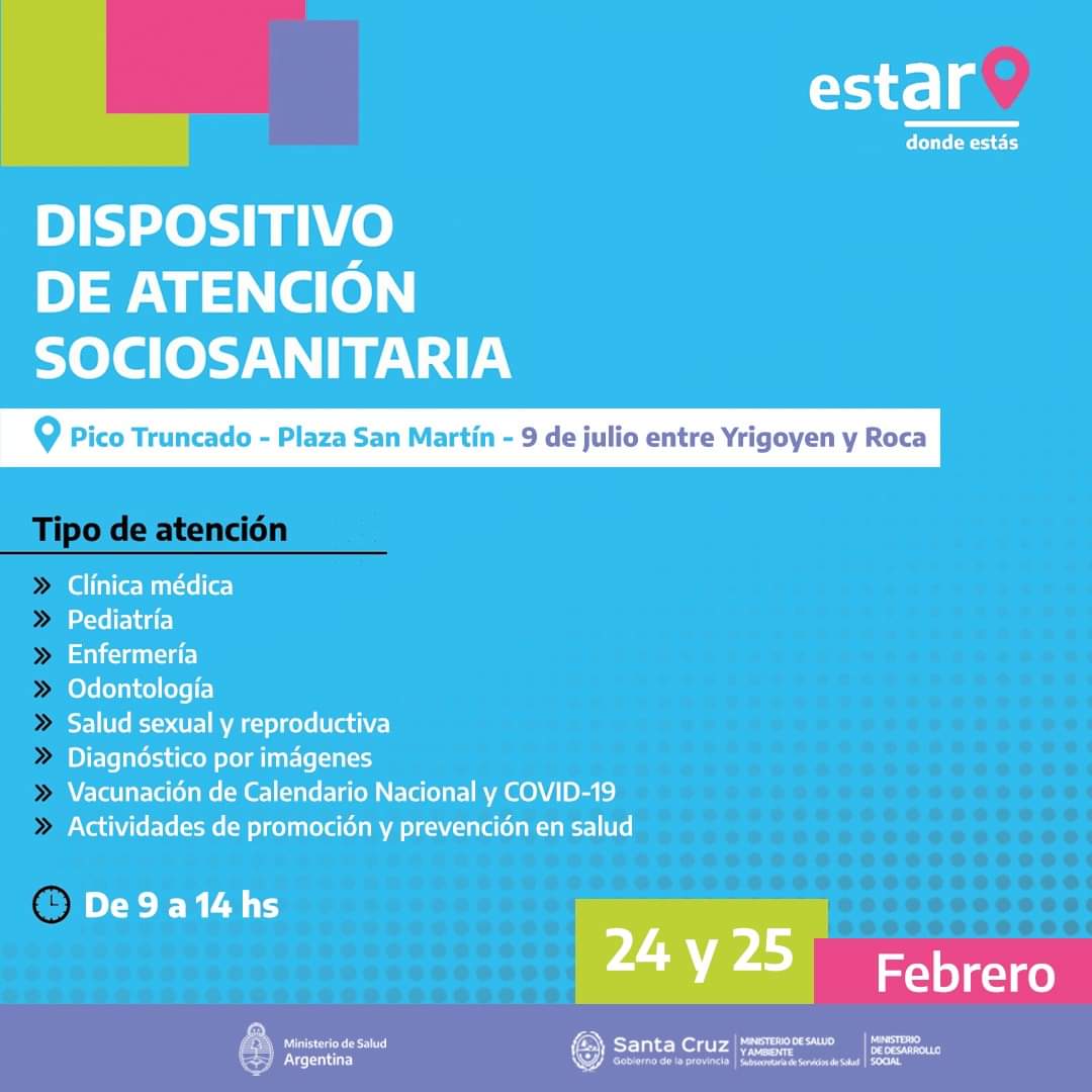Los dispositivos de atención sociosanitaria estarán en la localidad los días 24 y 25 de febrero en la Plaza General San Martín de 9 a 14hs. Los mismos atenderán de manera gratuita consultas sobre clínica médica, pediatría, enfermería, odontología, salud sexual y reproductiva, diagnóstico por imágenes, vacunación de calendario nacional y COVID-19, entre otros.